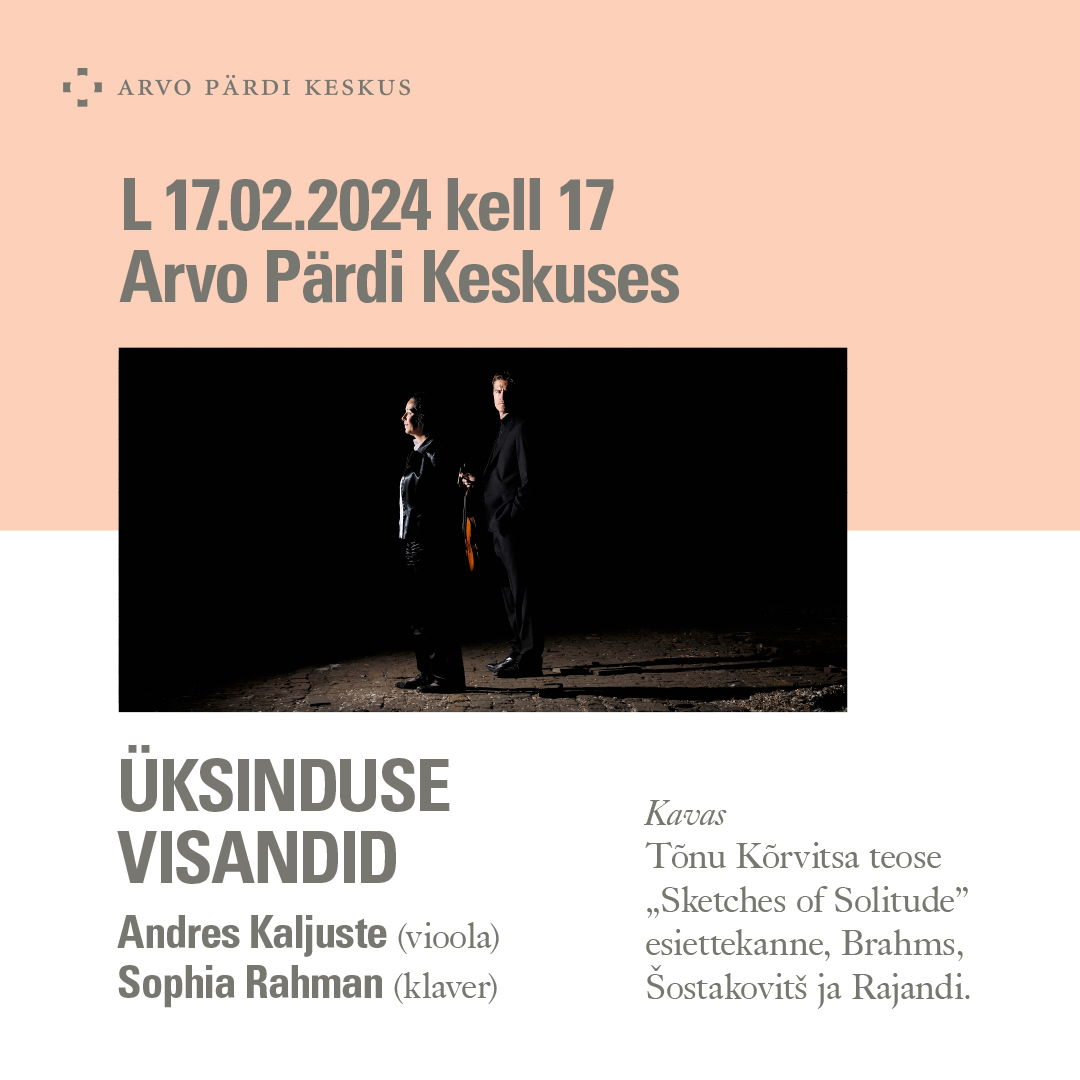 17. veebruaril annavad Arvo Pärdi Keskuses kontserdi „Üksinduse visandid“ Andres Kaljuste (vioola) ja Sophia Rahman (klaver). Esiettekandele tuleb Tõnu Kõrvitsa spetsiaalselt selleks kontserdiks kirjutatud Sonaat vioolale ja klaverile „Sketches of solitude“. Lisaks kõlab Dmitri Šostakovitši viimaseks jäänud suurteos, mis valmis vaid mõned päevad enne helilooja surma – Sonaat vioolale ja klaverile op. 147. Sophia Rahman esitab Johannes Brahmsi Intermezzo nr 1 Es-duur op. 117. Andres Kaljuste toob ettekandele möödunud aastal esietendunud lavastuses „Elajannad“ kõlanud Mingo Rajandi teose „Südame veri“ soolovioolale.